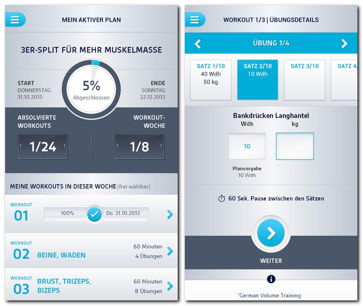 Dadurch dass wirklich so eine Vielzahl an Plänen verfügbar ist, gibt's wohl für jeden Fitness-Typen etwas zu finden. Von einfachen Cardioplänen bis zu Einheiten mit über 10 Übungen (12 sollten so das Maximum sein, hab ich mir bei meinem Probetraining mit Trainer sagen lassen). Ebenso verzichten viele Pläne auf Geräte - es ist also nicht unbedingt ein Vertrag in einem Fitnessstudio nötig, um erfolgreich zu starten.
